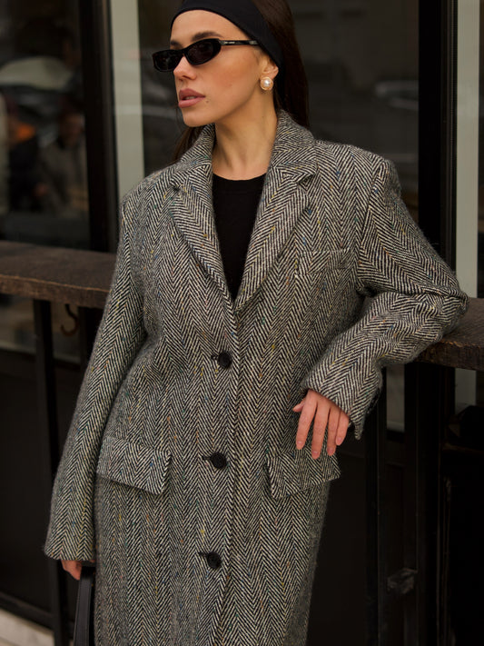 Wollmantel mit maskulinen Schultern, graues Fischgrätenmuster