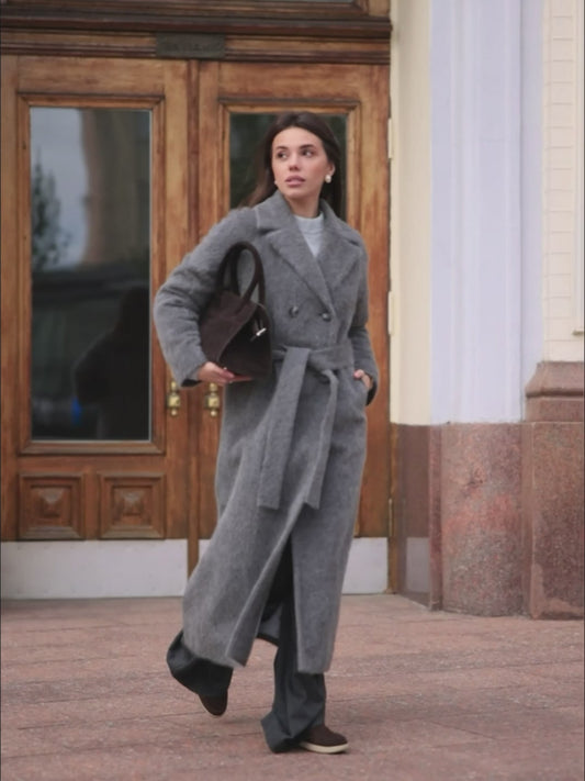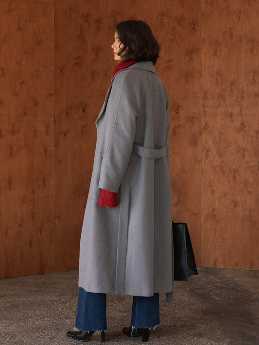 AusverkauftXS S M L XLLanger grauer Wollmantel mit Gürtel
