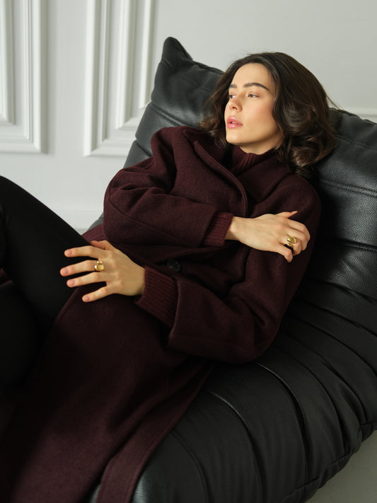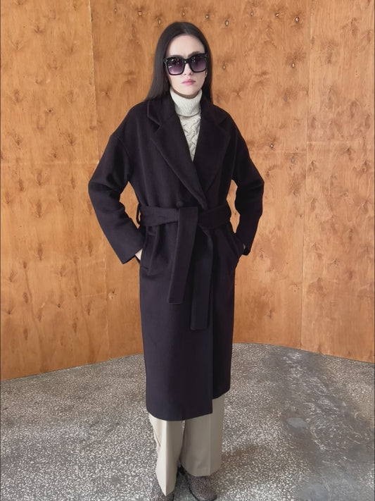 AusverkauftXS S M L XLLanger Wollmantel in Dunkelbraun mit Gürtel