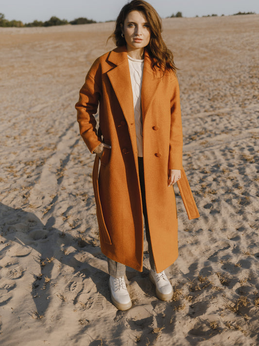 AusverkauftXS S M LRostroter zweireihiger Wollmantel mit Gürtel