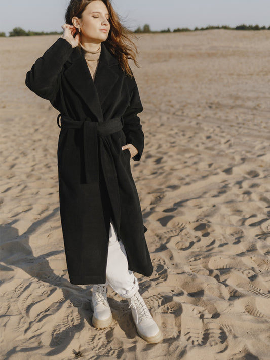 AusverkauftXS S M L XLSchwarzer Wollmantel mit Gürtel