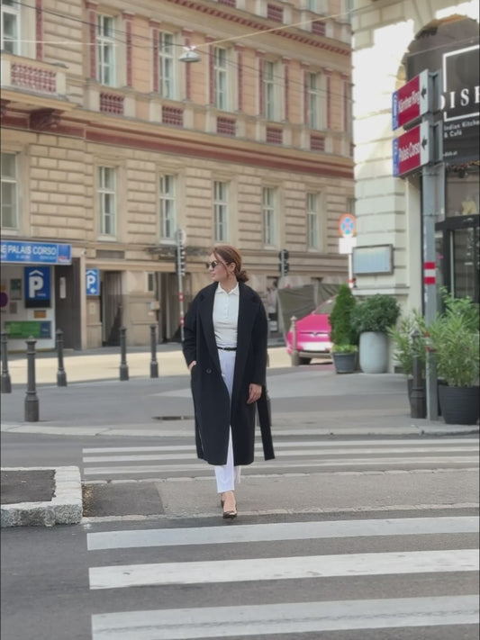 Schwarzer Zweireihermantel aus Wolle mit Gürtel