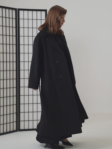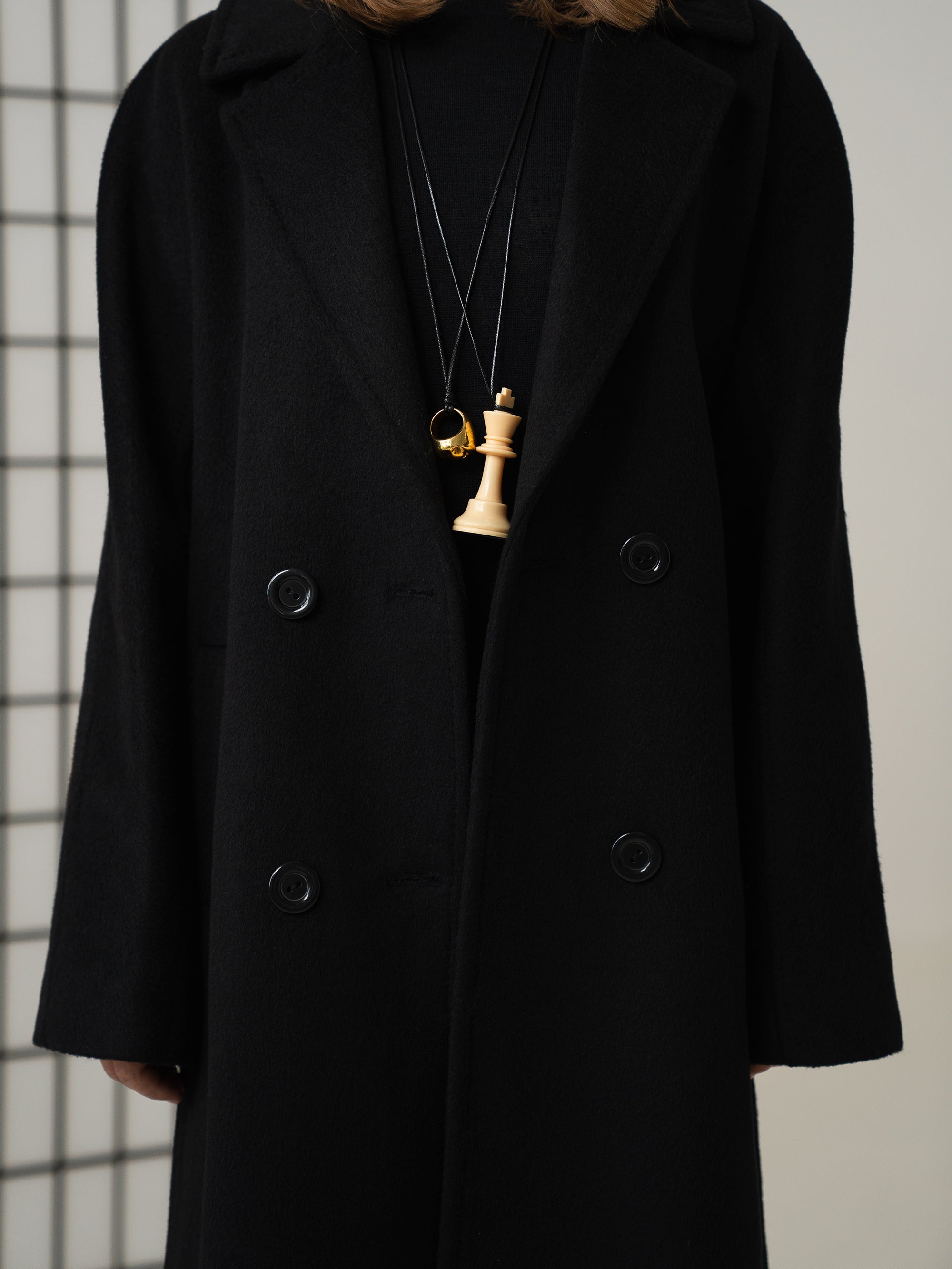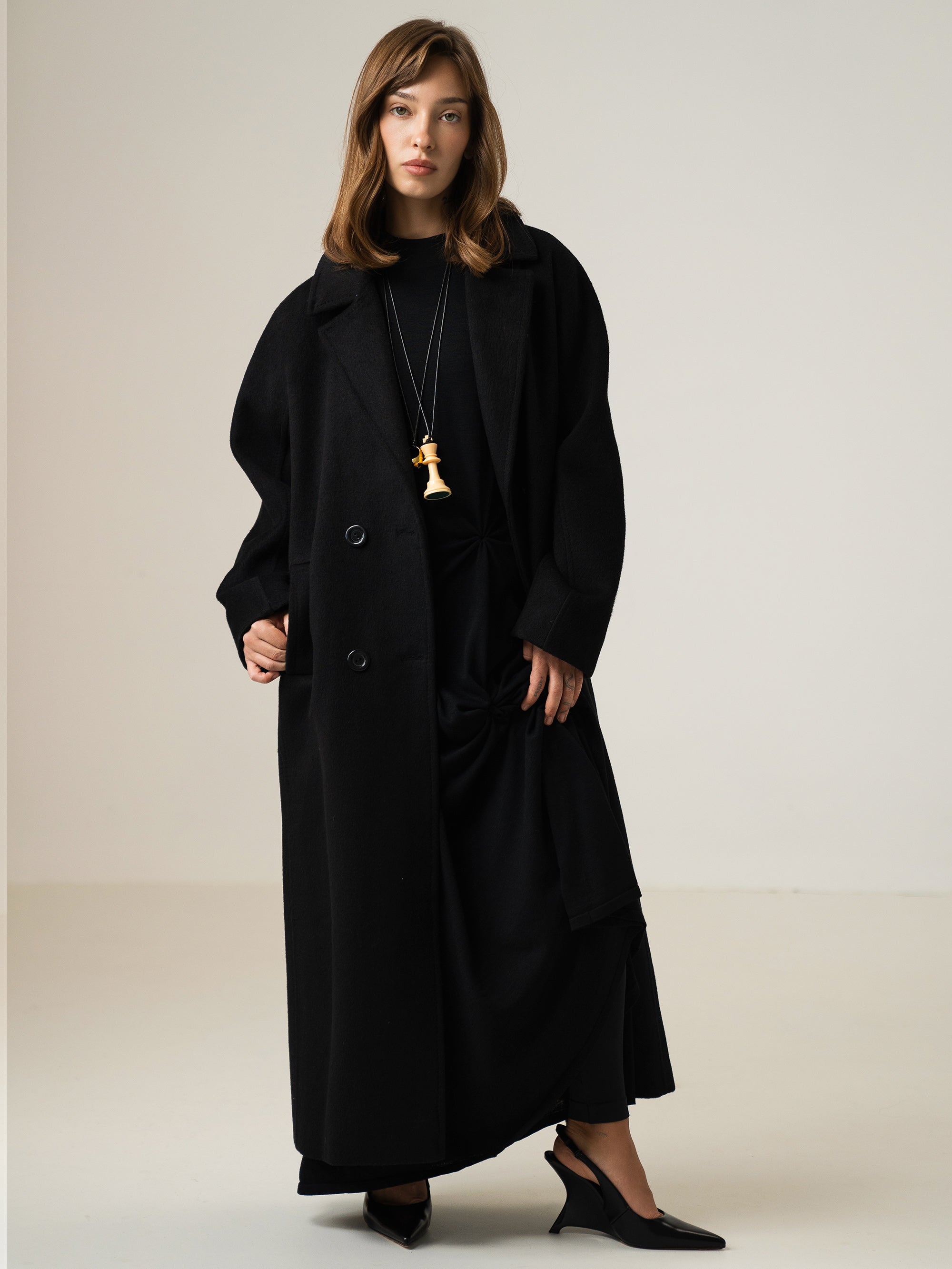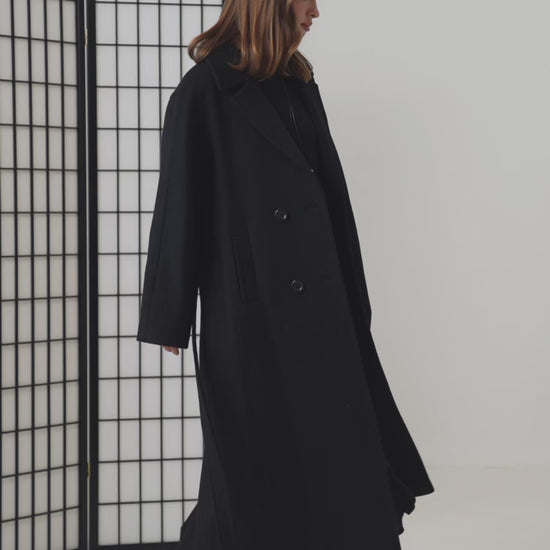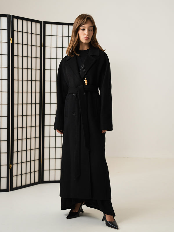 Kaufen Sie noch heute online einen langen schwarzen Wollmantel mit Gürtel und erleben Sie die unvergleichliche Qualität von CHÉLIE.